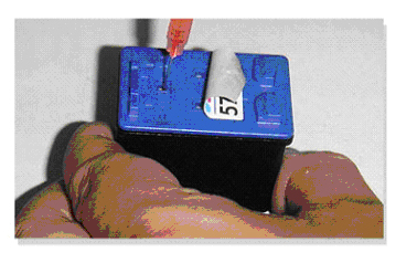 2.將針筒插入墨匣填墨,黑色約填5~8CC 彩色每色約填2~3CC,請慢慢灌入,速度不用太快,因為裏面是海綿加太快會溢出,如溢出用針筒再吸回即可